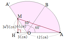 高校では,右図AMの長さを求める公式があるが,中学では「直角三角形を組み合わせて,三平方の定理で求める」しかない.AO=12, OM=6, ∠MOH=60°から,OH=3, HM= 直角三角形AMHについて,三平方の定理を用いると |
