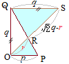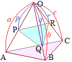 断面図は右図のようになるから,三平方の定理を用いて,OHの長さを求めることができるA 上記の図1の場合において,p=2, q=4であるから 次に (三角錐OPQR) =(三角錐OABC)× =(三角錐OABC)× =(三角錐OABC)× また (三角錐OABC)= 結局,求める体積は |