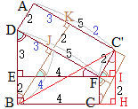 (解答)(ウ) 右の展開図において,BC’の距離を求めるとよい. △DEFは,DE=3, EF=4, FD=5の直角三角形 △DBJは,△DEFと合同だから,DJ=3, JB=4, BD=5 したがって,AK=3, KC’=2 △BKC’に対して,三平方の定理を適用すると (別解) △C’ FIは,△FDEと相似だから △BHC’に対して,三平方の定理を適用すると |