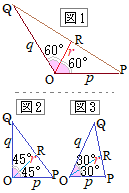 • OP=p, OQ=q, OR=rとおくとき,右図1のように∠POR=∠ROQ=60°のとき,※∠POR=∠ROQのとき,いつでもこの簡単な公式が成り立つわけではなく,45°,30°のときは,もう少し複雑になる. • ∠POR=∠ROQ=45°のとき, • ∠POR=∠ROQ=30°のとき, ※この公式を,覚える必要はない.「ORを含む相似図形を作る」ことがポイント.