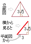 うっかり読むと「ワナ」が仕組まれているかもしれません.「立面図は1辺が6cmの正三角形!!側面の三角形の底辺は6cmであるが,三角形の高さは 側面積は, これらの和から,表面積は,108(cm2) |