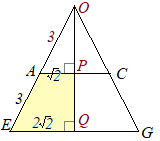 ABCDは1辺の長さが2cmの正方形だから,対角線ACの長さは同様にしてEFGHは1辺の長さが4cmの正方形だから,対角線EGの長さは このとき,明らかに△OAPと△OEQは相似図形で,底辺の長さAP:EQ=1:2だから,OA:OEも1:2となり,OA=3, OE=6 それぞれの直角三角形△OAPと△OAQに三平方の定理を使って,高さOPとOQを求めると 四角錐O-ABCDの体積は 四角錐O-EFGHの体積は 求める四角錐台の体積は,これらの差だから |