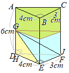 下の図のように,AB=4cm,BC=3cm,AD=6cm,∠ABC=90°の三角柱P ,GH=3cm ,HI=4cm ,IJ = 3 cm , ∠GHI = ∠GHJ = 90° の三角錐Q があります。三角柱Pの体積は,三角錐Qの体積の何倍ですか,求めなさい。 ![]() (北海道2017年入試問題)