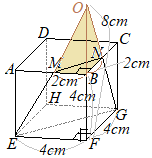 右図のようにEMの延長線,FBの延長線,GNの延長線は1点で交わる.この点をOとすると,O-MBN, O-EFGはいずれも三角錐になる.三角錐O-EFGの体積は 三角錐O-MBNの体積は これらの差が求める図形の体積になる |