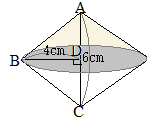 【問題6.2】右の図Uの△ABCは,BA=BCの二等辺三角形である。この△ABCを,辺ACを軸として1回転させてできる立体の体積を求めなさい。 (鳥取県2016年入試問題)