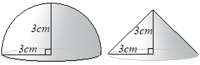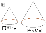 右の図の2つの円すいA,Bは相似で,その相似比は2:3です。円すいAの体積が40cm3のとき,円すいBの体積を求めなさい。