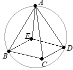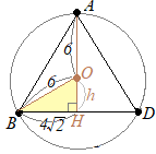 底面BCDEは,1辺の長さが8cmの正方形だから,その対角線BDの長さは,三平方の定理により求めることができてそこで,この正四角すいを△ABDを含む平面で切った断面を考えると,右図のようになる. なお,「球の中心は正四角すいの中にある」という問題文や図から見て,BDは球の中心Oよりも下にある. また,AOの延長がBDと交わる点(正方形BCDEの対角線の交点)をHとし,OH=hとおく. そこで,正四角すいABCDEの高さはAH=8となる. |