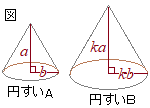 小学校以来,体積比は相似比の3乗比と覚えますが,この問題のような円すいの場合に,その公式の証明は次のようになります.AとBの相似比(縦および横の長さの比)が1:kのとき となるから |