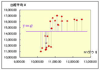 ■解説 (1) 一番簡単な最小二乗法 右の表は,2005.1月〜2006.12月までの月ごと(5日頃)のNYダウ平均株価(単位ドル)と日経平均株価(単位円)です. [資料の出所:http://finance.yahoo.com/ のデータベース] これらを散布図に表わすと下のグラフのようになります. ![]() このとき,yの値(日経平均)を1つの定数 a で近似するには,図の青で示した横線(y=a)を求めることになります. 図の赤で示した測定値と青で示した予測値の差は,灰色の線の長さで示されますが,正負の符号があるので,単純にデータの個数分足せば消えてしまいますので,2乗を考え,(測定値-予測値)2の和: S=(y1-a)2+ (y2-a)2+ (y3-a)2+ ・・・+ (yn-a)2 ・・・(A) が最小となる a の値を求めることにします. この問題のように,(測定値-予測値)2の和が最小となるような予測値を求める方法は最小二乗法と呼ばれます. |