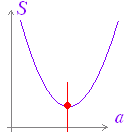 (参考) ここで求めたa の値は,次の変形で分るようにy の平均値となっています: S=(y1-a)2+ (y2-a)2+ (y3-a)2+ ・・・+ (yn-a)2が最小となるa の値を求める⇔2次関数Sが最小となるaの値を求める⇔頂点の座標aを求める ![]() =na2 - 2a(y1+y2+···+yn)+... =n { a2 - 2a(y1+y2+···+yn) / n} + ... =n(a - (y1+y2+···+yn) / n}2+... の頂点の座標(軸)a は a = (y1+y2+···+yn) / n となり,a が y の平均値に等しいときに,S は最小となります. |