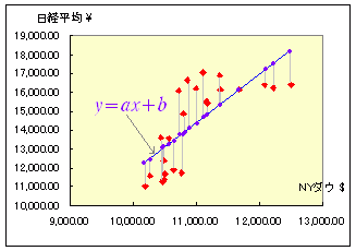 ○ 裏付けで確かめる: ※ 先の例の式(A)と異なり, S=(y1- ax1 -b)2+ (y2- ax2 -b)2+ (y3- ax3 -b)2+ ・・・+ (yn- axn -b)2 ・・・(B) のような式を変形するのは大変ですので,何を求めているのかということさえ分れば,実際の計算はコンピュータにまかせます. 1) 係数 a ,b をExcelで求める他の方法として,「散布図に近似直線を表示し,その方程式を表示する」には次のようにします. 上の表でB1,C1のラベルを含めてB1:C25の範囲を選択して,グラフウィザードにより散布図を表示します. 次に,グラフ領域をクリック(選択)しておいてから,メニュー→「グラフ」→「近似曲線の追加」→「線形近似」 さらに,表示された直線をダブルクリックし,「オプション」で[グラフに数式を表示する]にチェックを入れます. これで,回帰直線(近似直線)の方程式が表示されるので,自分で求めた定数項とxの係数と比較することができます. 2) 係数 a ,b をExcelで求める他の方法として,ツールの回帰分析を用いる方法があります. メニュー→「ツール」→「分析ツール」→「回帰分析」→ 入力y範囲:$C$1:$C$25 ・・・(ラベルも含める) 入力x範囲:$B$1:$B$25 ・・・(ラベルも含める) ラベル:チェックを入れる ※入力範囲のyとxを逆にすると,日経平均でNYダウを説明する(NY=従属,日経=独立)ことになり,意味が変るので注意 出力される表のうち,左下の方に表示される次の値が各々b , a の値となります.