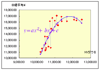 この期間の日経平均とNYダウは,直線関係というよりは2次関数に近い関係にも見えます.そこで,より正確な予測式を求めるために