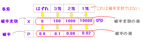 ○【例1】 100本のくじで,1等10000円が2本,2等1000円が8本,3等100円が10本,残りがはずれとなっている場合に,このくじをよくまぜてから1本引いて起こる事象,賞金,確率は,次の表のようになる.![]() |