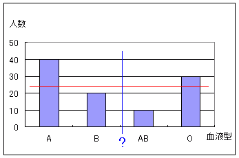 ×【例2】 100人の生徒の血液型が,A型40人,B型20人,AB型10人,O型30人であったとき,これらの血液型について,度数分布表,相対度数分布表を作ることはでき,1人抽出したときの各血液型の生徒が選ばれる確率は定まるが,A型,B型,AB型,O型などは確率変数ではない.![]() (グラフ中の赤線で示した値は,単に度数の平均を表わしており,確率変数の平均として想定されるものがあるとすれば,グラフ中の青線のようなものとなる.血液型の平均値はない.) この例のように,定性的な性質で分類したデータ(カテゴリーデータ)の分類名(カテゴリー)は,そのままでは確率変数には使えない. |