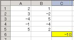 次のように,ベクトル の成分 x1,x2,x3,・・・,x5 がセルA1〜A5に入力されており, ベクトル の成分 y1,y2,y3,・・・,y5 がセルB1〜B5に入力されているとき, ![]() =SUMPRODUCT(A1:A5,B1:B5) で求めることができる. [ 積(PRODUCT)の和(SUM)の意味 ] Excelのメニューから関数を選択するときは,メニュー→「挿入」→「関数」→「数学/三角」→SUMPRODUCT (配列1にA1:A5,配列2にB1:B5を指定する.配列3は空白) ※ SUMPRODUCTは要素数が等しい列と列,行と行に使える. ※ C1に=A1*B1とし,この式をC2からC5にコピー貼り付けの後,C6に=SUM(C1:C5) としても同じ結果が得られる. |