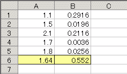 1例 (他の方法でもよい) (1) A3に =(A1-A2)^2 を書き込む. (2) A3をポイントし,セルの右下でマウス形状が十字になったら,D3までドラッグする. (3) E3に =SUM(A3:D3)と書き込む.E3の値が答. |