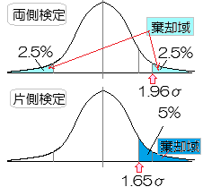 〇 これに対して,上記の例Bにおいて,対立仮設H1を「表が出る確率が,裏が出る確率よりも大きい」として,帰無仮説H0を「表が出る確率と裏が出る確率は等しい\(\displaystyle (\frac{1}{2})\)とする」場合は片側検定になる.〇 棄却域を両側にとって,合計で5%とすると,片方の棄却域の確率は各々2.5%となり,中央から約1.96σだけ離れた値が限界値となる. これに対して,対立仮設としてM1<M2(またはM1>M2)だけを選ぶと片側検定となり,棄却域に入る確率は一方だけで5%となり,中央から約1.65σだけ離れた値が限界値となる. 当然のことながら,片側検定にすると一方の棄却域が広がるので,対立仮設が成立し易くなるが,両側検定か片側検定かの判断において,データ収集後に「判断の楽な方を選ぶ」ようなことは厳に慎まなければなければならないとされている. |