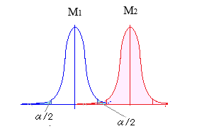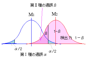 M1≠M2,すなわち,M1<M2でもM1>M2でもよいと解釈するのが両側検定