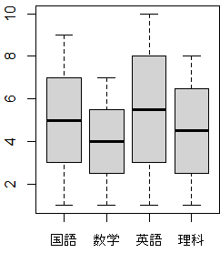 ⇒ 目で見て,計算するしかない 四分位数を用いた散らばり具合の分析は,総数が数十とか数百という普通に出あう大きなデータに対しては,些細な相違はほとんど影響しないが,データ数が10個程度の場合,中学・高校の教科書で教える四分位数計算の決め方とExcelなどコンピュータソフトで計算した結果とは,食い違うことがある. この結果は,箱ひげ図にも反映する.