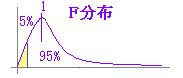 F検定は通常分散の大きい方を分子,小さい方を分母として片側検定で行い,上のようなF分布曲線において上側5%の区間(黄色の部分)に入るほど大きければ分散に有意差がある(分散が等しくない=不等分散)とみなす.(印刷物:統計の参考書などについているF分布表では分子の分散が大きい場合のみ掲載されている.)