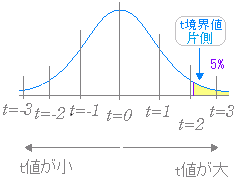 この分析ツールでは左欄(飼料1)の平均が右欄(飼料2)の平均よりも小さいときにt値が負(逆ならば正)で表示され,[t境界値両側]よりも絶対値が大きければ外側に来る.