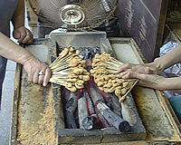 一方は元祖、一方は本家。いずれもあぶり餅を商う。細く削った竹串の先に切り込みをいれ小さな餅をまるめ炭火であぶり、ほのかに甘い味噌だれをつけて出す。なかなかの美味。双方の店秘伝のたれに微妙な味付けを競うが、おおむね似たものである。
